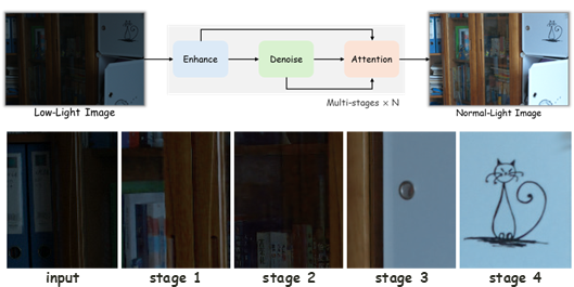 We propose a multi-stage model for progressive low-light image restoration, disentangling illumination enhancement and noise removal within each stage to mitigate ISP-induced coupling.